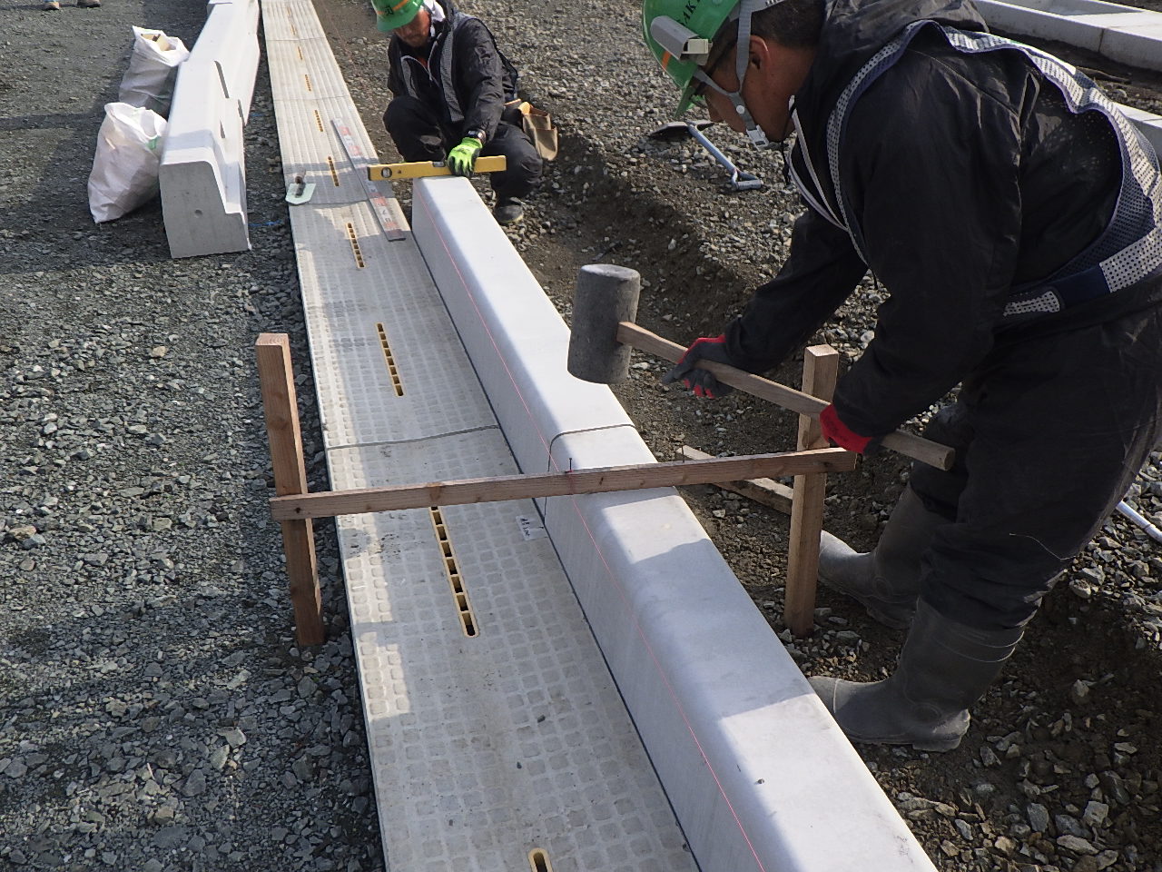 市道道路改良舗装工事にて、アスファルト舗装を行う前の工程として、歩車道ブロックおよび地先ブロックの施工を進めています。10月末には岩手山にも初雪が降り、寒さが身に染みる季節となりましたが、体調を崩さないよう気を付けながら引き続き安全第一で作業に取り組んでまいります。