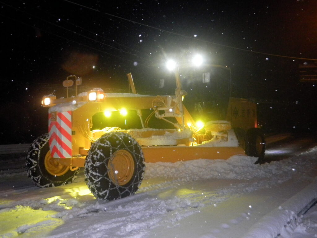 今シーズン初の除雪作業が行われました。毎日、路面の積雪や凍結の状況を確認し、皆さまの出勤や登下校に影響が出ないよう、深夜から除雪作業を進めています。また、道路構造物との接触事故を防ぐため、事前に危険箇所へ目印を設置し、安全運転を心がけながら作業を行っています。日々の点検や整備もしっかり行い、安心して出動できる体制を整えています。