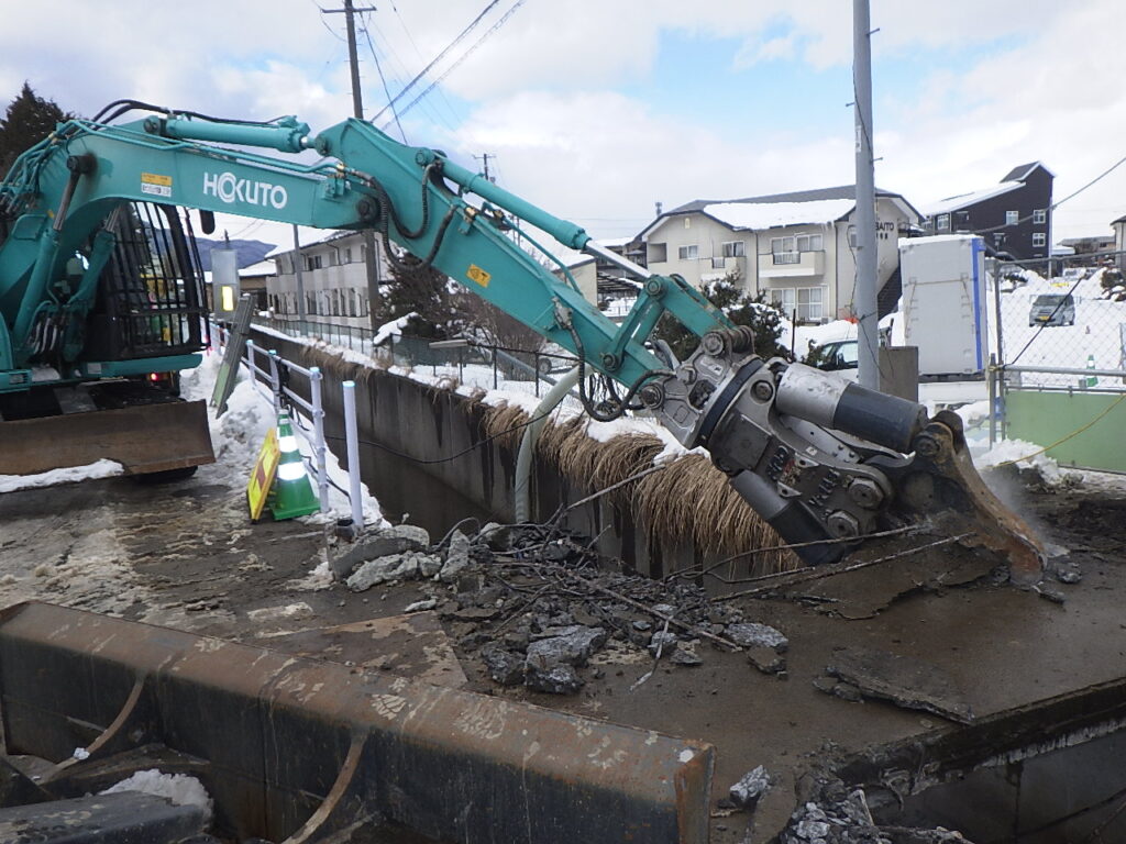 矢巾町南矢幅地内の「町道下花立6号線」沿いの新川に架設してある老朽化した神前橋の架け替え工事を行っています。現在は、経年劣化した大型のプレキャストボックスカルバート(内幅3.0m×内高2.0m)をバックホーのアーム先端に取付し、油圧によって作動(開閉・旋回)して圧砕する大割機(大割圧砕機)で取り壊し作業を行っています。