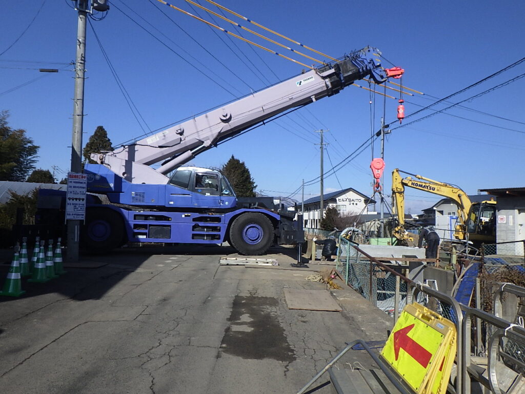 現在、経年劣化により脆くなったボックスカルバートを撤去し、新しいボックスカルバートへ取り替える工事を進めています。住宅地内での作業のため、誘導員を2名配置し、一般の方を優先した安全な通行誘導を行っています。また、設置する構造物が大型であることから、吊り荷作業の際は周囲の人払いを徹底し、挟まれ事故の防止に努めています。今後も安全第一で作業を進めてまいります。