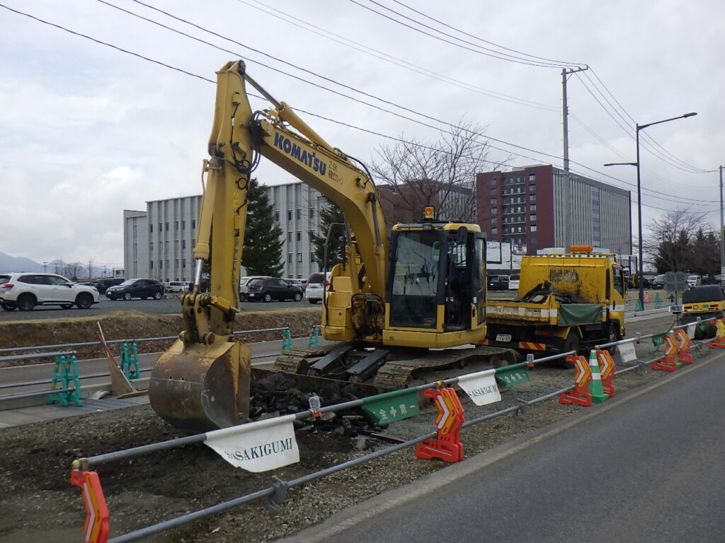 今ある舗装を剥がす作業で、綺麗に剝がしやすいように先に切れ目を入れ、 その切れ目に沿って舗装を剥ぐ作業を行いました。交通規制を行いながらの作業となりましたが、工事看板の設置や交通誘導警備員を配置し安全作業に努めております。